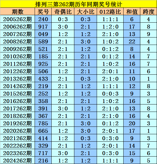 本期为陈列三第2025262期开奖,历史上陈列三第262期已开出了20期奖号了: