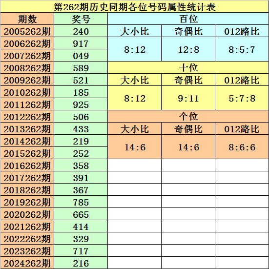 在第262期历史同期开奖中,号码0-9出现频次从高到低区别为:号码5→9次;号码1、2→8次;号码9→7次;号码3→6次;号码4、6、7→5次;号码8→4次;号码0→3次。一般来说,说明最热的号码:1259中至少出现1个奖号。同期奖号不会沿途出咫尺说明最冷的号码中。