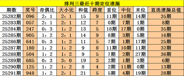 开奖回来:陈列三第2025291期奖号:948,定位直选遗漏值5期、4期、19期,遗漏总值为28期。