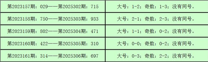 则,3D第2023162期开出奖号:022,其大小比为0:3,奇偶比为0:3,012路比为1:0:2,与3D第2025307期奖号可能莫得同号。
