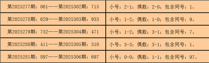福彩3D第2025302期-第2025306期聚会5期开出号码别离为:715-933-471-310-697。