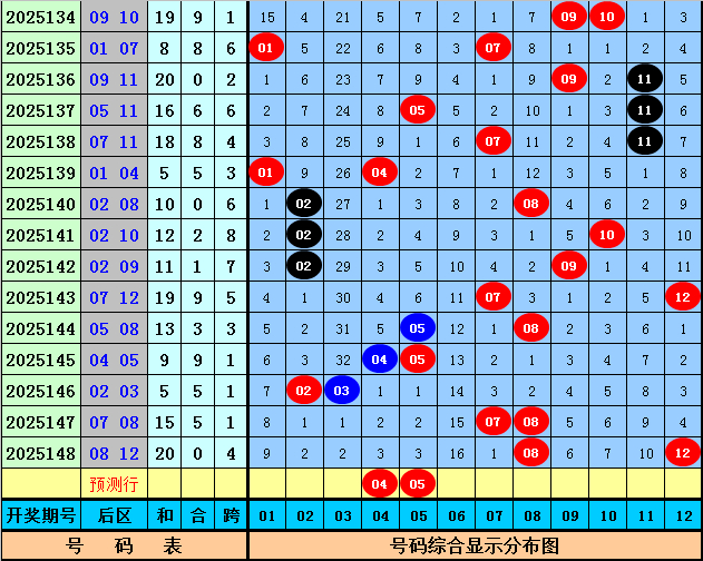后区上期开出奖号08和12,该组合历史上出现了37次,其下期奖号频次离别为:号码03、05、10出现10次,08、11出现7次,04、09出现6次,01、06出现4次,07、12出现3次,02出现2次,本期后区参考号码01、02、04、05,精选两码04和05。