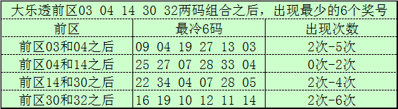 前区冷码统计:大乐透第25148期前区奖号为:03、04、14、30、32,为止第25148期历史上大乐透也曾开出了2816期奖号了,在聚拢两码奖号中: